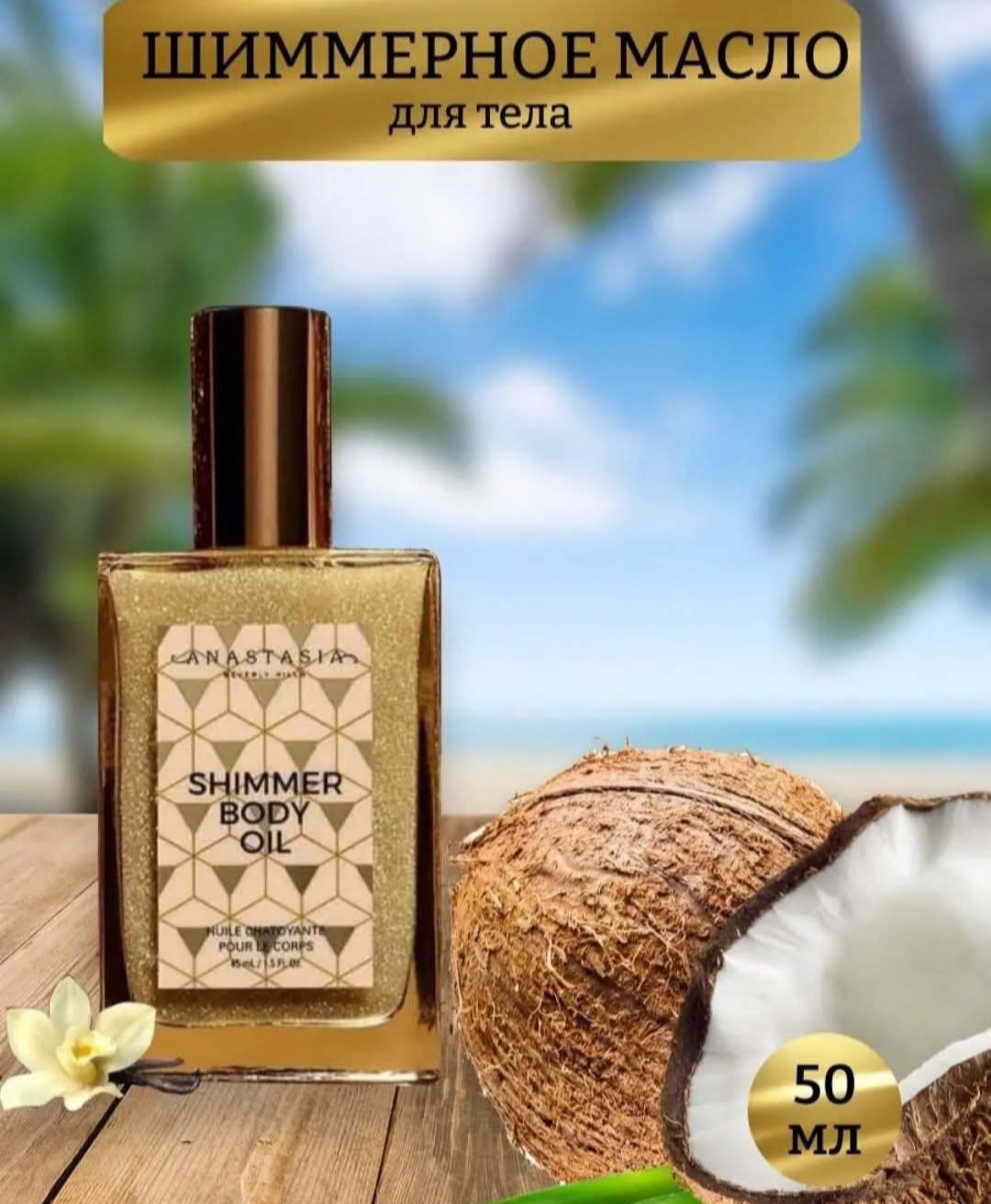 ქოქოსის შიმერებიანი ზეთი ატენიანებს სხეულს და ბზინავს მზის სხივებზე..